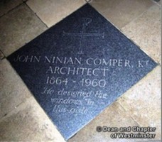 In 1907 the Dean of Westminster approached Comper to design a series of eight stained glass windows for the north side of the nave depicting figures of Kings associated with the Abbey together with an Abbot of Westminster from the same era and in 1932 Comper provided the furnishings for the Warriors Chapel in the nave (now St George's Chapel). Sir John Ninian Comper died on the 22nd December 1960 in The Hostel of God, now Trinity Hospice, in Clapham, London, a Hostel run by the Sisters of St Margaret from East Grinstead, the same Order that his father had brought to Aberdeen to share his work amongst the poor. It was very appropriate that the Sisters of St Margaret were there to care for Ninian at the close of his earthly. His ashes were buried beneath the windows he designed in the Abbey. The stone marking where Sir Ninian's ashes are buried was originally of slate but became very worn and it was replaced by a new granite stone cut by Sebastian Comper, Sir Ninian's son, with a Chi Rho cross at the top. |