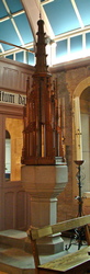 It was soon decided by the then Priest-in-Charge, the Revd William Lachlan Mackintosh, that the church must also move. During the work to move it stone by stone between 1903 and 1904, a full-sized stone altar was erected, around which were placed four black wrought iron riddel posts, topped by four gilded Angels, each holding a taper, designed by Ninian Comper. The new church was dedicated to St Michael and All Angels. One unique feature in the new church was created the following year, 1905, when an impressive stone font on top of a three step pedestal was placed by the west end of the church. The most spectacular feature is its very fine steepled oak lofty cover. |