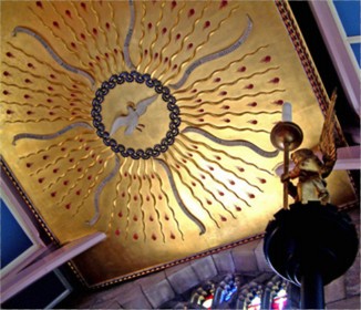 The magnificent stained glass Window of the Archangels above the altar with its Comper riddel posts and angels holding tapers on the east wall of St Michael's, and the Gilded Tester above, carved with a dove, both to designs by Ninian Comper, were later additions, in memory of Canon Mackintosh, St Michael's great benefactor, who died in 1926 and who is depicted keeling at a prie-dieu in the third window. The Archangels Uriel, Michael, Gabriel and Raphael (left to right)) are depicted in the window in the subtle colours favoured by Comper. The Gilded Tester above the High Altar depicts the Holy Spirit and Pentecost, with the tongues of fire radiating from the Dove, the Holy Spirit, with the seven 'Gifts of the Spirit' - Love, Joy, Peace, Patience, Kindness, Goodness and Faithfulness - inscribed around the border. |