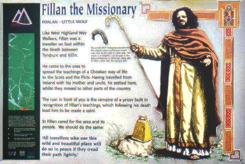 Today, on the West Highland Way, the 96 mile walking route running from Milngavie north of Glasgow to Fort William, St Fillan has a mention on a plaque in Strath Fillan as "a traveler on foot within the Strath between Tyndrum and Killin". It continues, "He came to the area to spread the teachings of a Christian way of life to the Scots and the Picts. Having traveled from Ireland with his mother and uncle, he settled here, whilst they moved to other parts of the country." "The graveyard close by had many old stones in it - the oldest we could read recorded a man who died in 1752. To the right were the remains of what we assumed was the priory built in recognition of Fillan's teachings, which following his death led him to be made a saint. St Fillan cared for the area and its people. We should do the same. All travelers who use this wild and beautiful place will do so in peace if they tread their path lightly.″ |